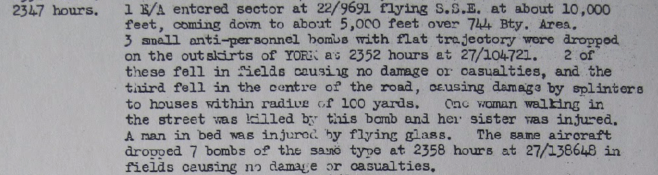 According to the reports of the 7th Anti-Aircraft Division, a solo Luftwaffe plane was responsible for the night raid and dropping of three anti-personnel bombs over Osbaldwick.