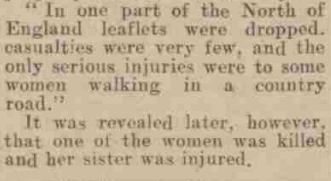 The incident was reported in the press the following day, but no particular details could be given for national security reasons, as it was assumed that Nazi German agents would be able to use particular details to feed back to Germany as confirmation of their intended targets being hit (or not) and that this would only hone the enemy’s ability to conduct more accurate raids in the future. All the same, the write-up in the North-Eastern Gazette is dismissive of the casualties, and it is hard not to read a misogynistic sentiment in the phrasing of it. [It is unclear if the mention of (Nazi propaganda) leaflets being dropped refers to this raid, possibly, or another.]