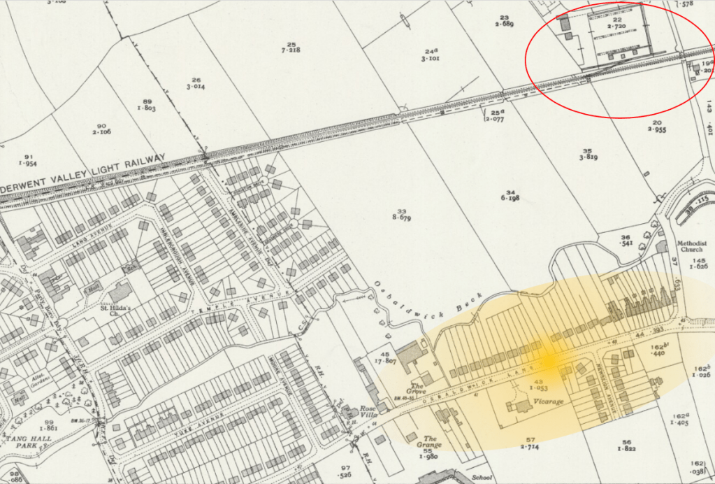 Was it an accidental dumping of bombs? Probably not, but it was unlikely this was the target. (Or if it was, it would more likely have been The Derwent Valley Light Railway junction and depot to the immediate north-east of Osbaldwick Lane). The German bomber was last seen over Filey at 01:00 heading eastwards.
