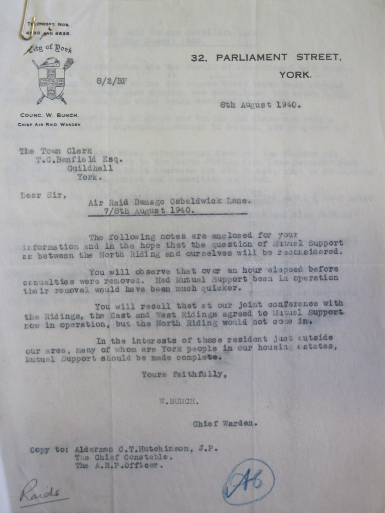 Bunch’s letter touches on a lack of established “Mutual Support” between City of York Council and North Riding would need to be reconsidered, as it had resulted in the casualties having not been removed for the scene of the bombing and dispatched for medical attention for “over an hour”, which was too long.