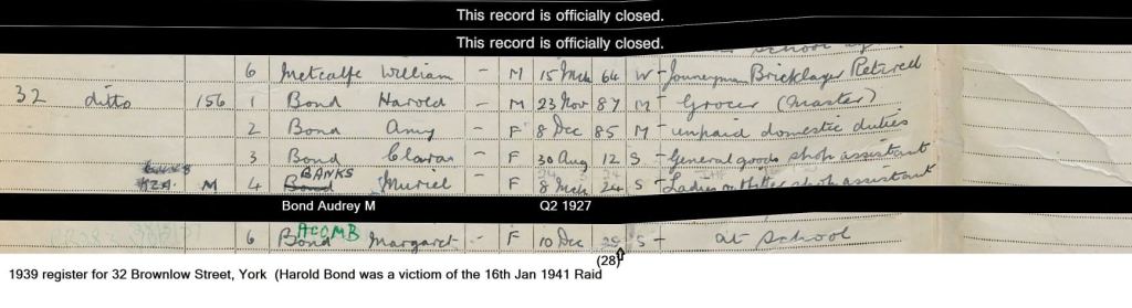 Thanks to Wing-Commander Newbould for making available his detailed archive research to the Raids Over York project team, and to Harold Bond, grandson of Harold Bond, for details of the bombing at No. 32 Brownlow Street & No.1 Dudley Street.