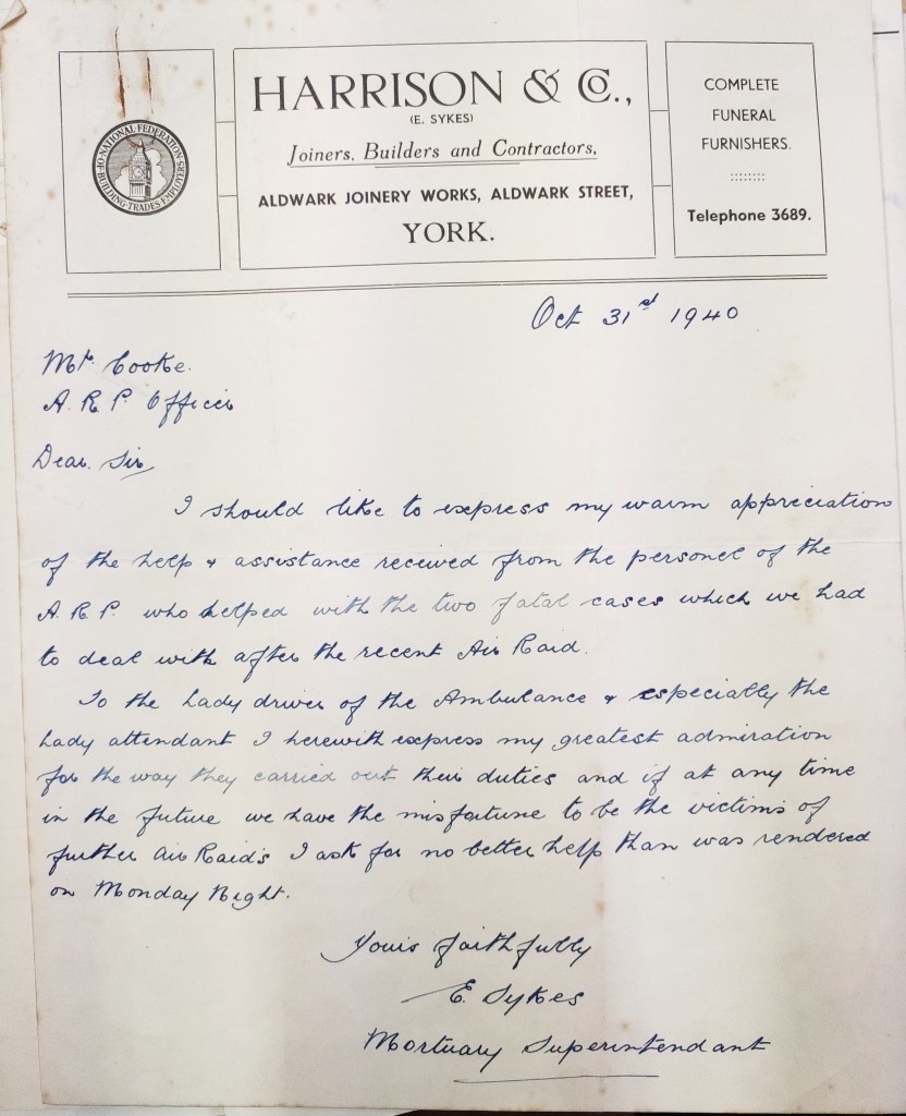 There was a further accolade for such war war immediately after the raid. The city’s mortuary superintendent, Mr. E. Sykes, wrote a letter to Mr Cooke at the A.R.P. Offices to express his “warm appreciation of the help and assistance received from the personnel of the A.R.P. who helped with the two fatal cases”. Sykes was particularly singled out a number of unnamed women for praise: “to the lady driver of the Ambulance” and “lady attendant” (who was, presumably, Joan Maw).
